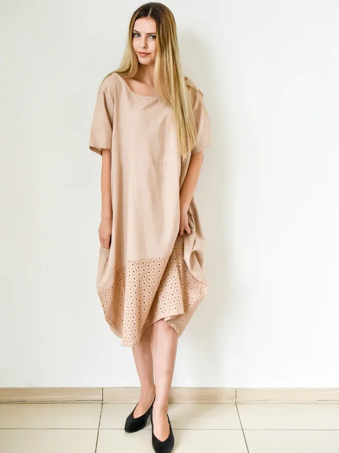 Туника Venera из 100% хлопка однотонная бежевая с натурально-льняным оттенком. Туника выполнена из хлопка средней плотности. Форма платья-туники фигурная, грушевидная, с отрезной кокеткой, кружевным подолом и двумя карманами в швах.