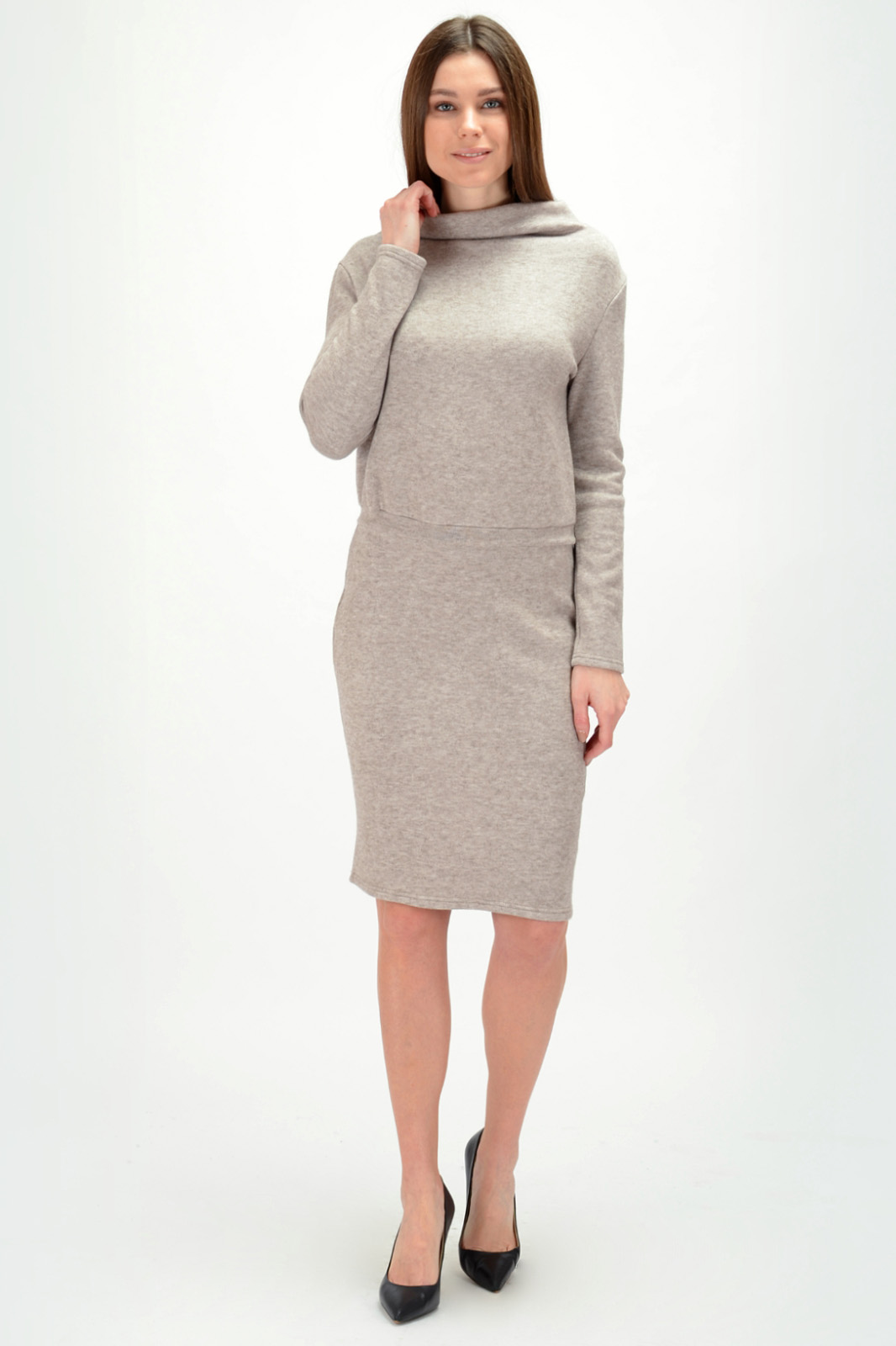 Платье из трикотажного полотна. Рукав длинный. Воротник- цельнокроенная стойка.Пояс втачной.