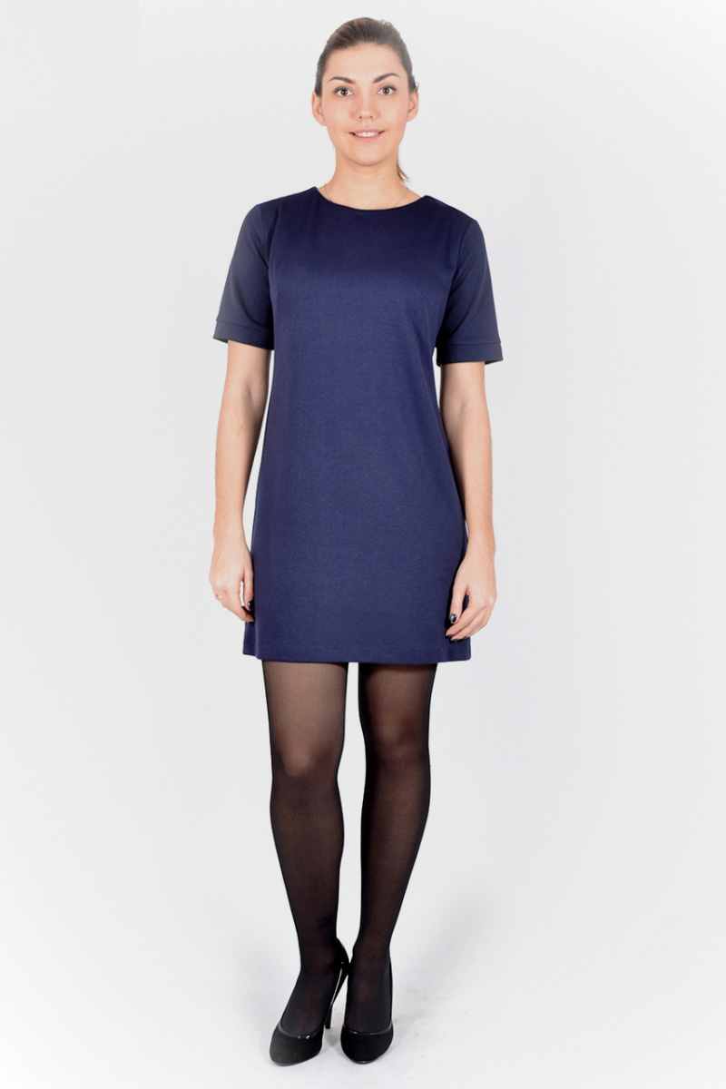 Изящное платье прямого силуэта выполнено из однотонного трикотажа.Сзади застежка до середины лопаток на декоративные пуговицы. Без подкладки.Рукав короткий.