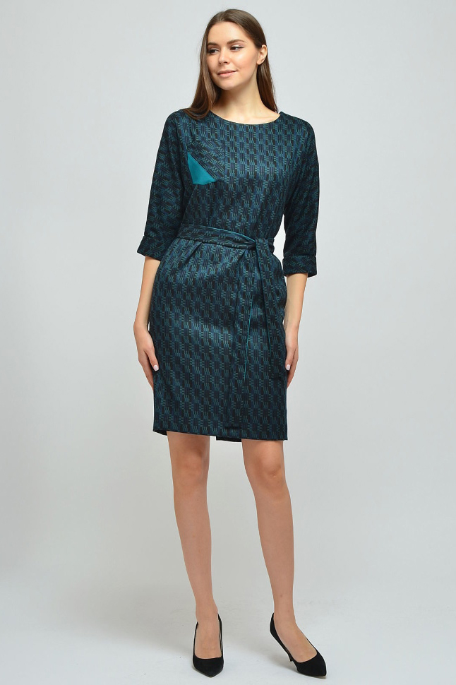 Платье женское прямого силуэта. Рукав цельнокроеный три четверти. На передней полочке накладной карман. Изделие дополнено двусторонним поясом.