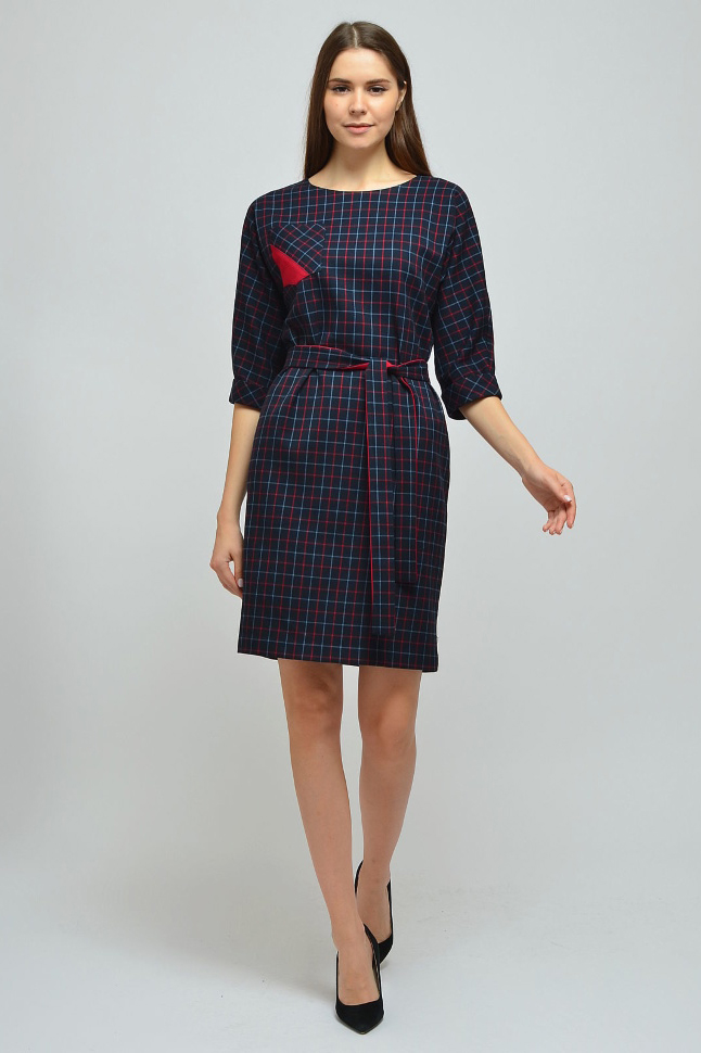 Платье женское прямого силуэта. рукав цельнокроеный три четверти. На передней полочке накладной карман. Изделие дополнено двусторонним поясом.
