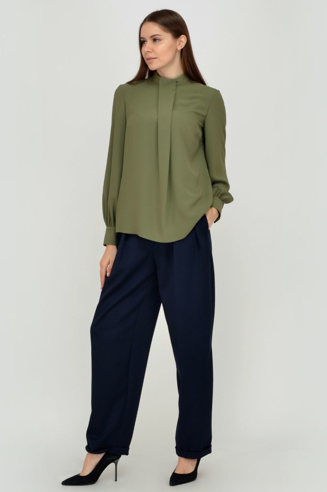 Блузка женская прямого силуэта.Рукав длинный на манжете. Воротник-стойка с застежкой на пуговицы. На передней полочке декоративная складка.