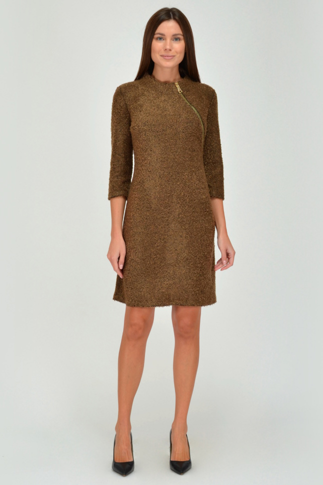 Платье приталенного силуэта с рукавом 3/4, без подкладки. Разъемная декоративная молния проходит от горловины по полочке и заходит на низ спинки.