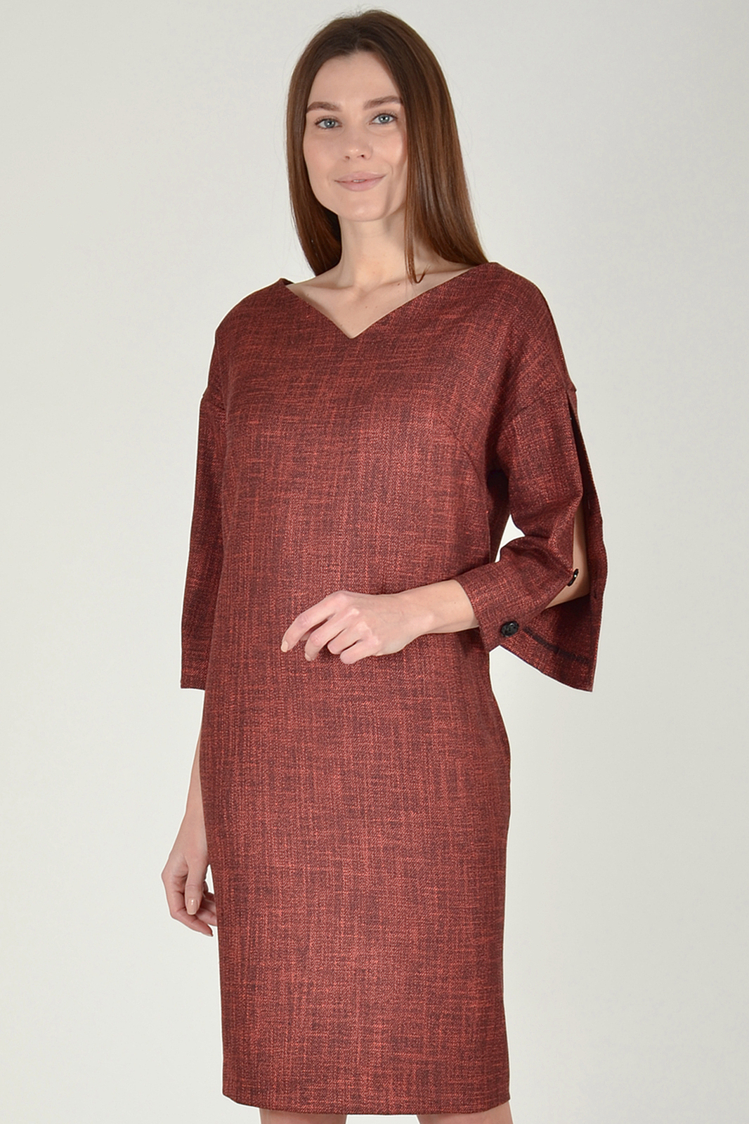Платье прямого силуэта.По спинке застежка на пуговицы.Рукав 3/4 с декоративными пуговицами. Вырез горловины фигурный.В боковых швах карманы. Платье на подкладке.