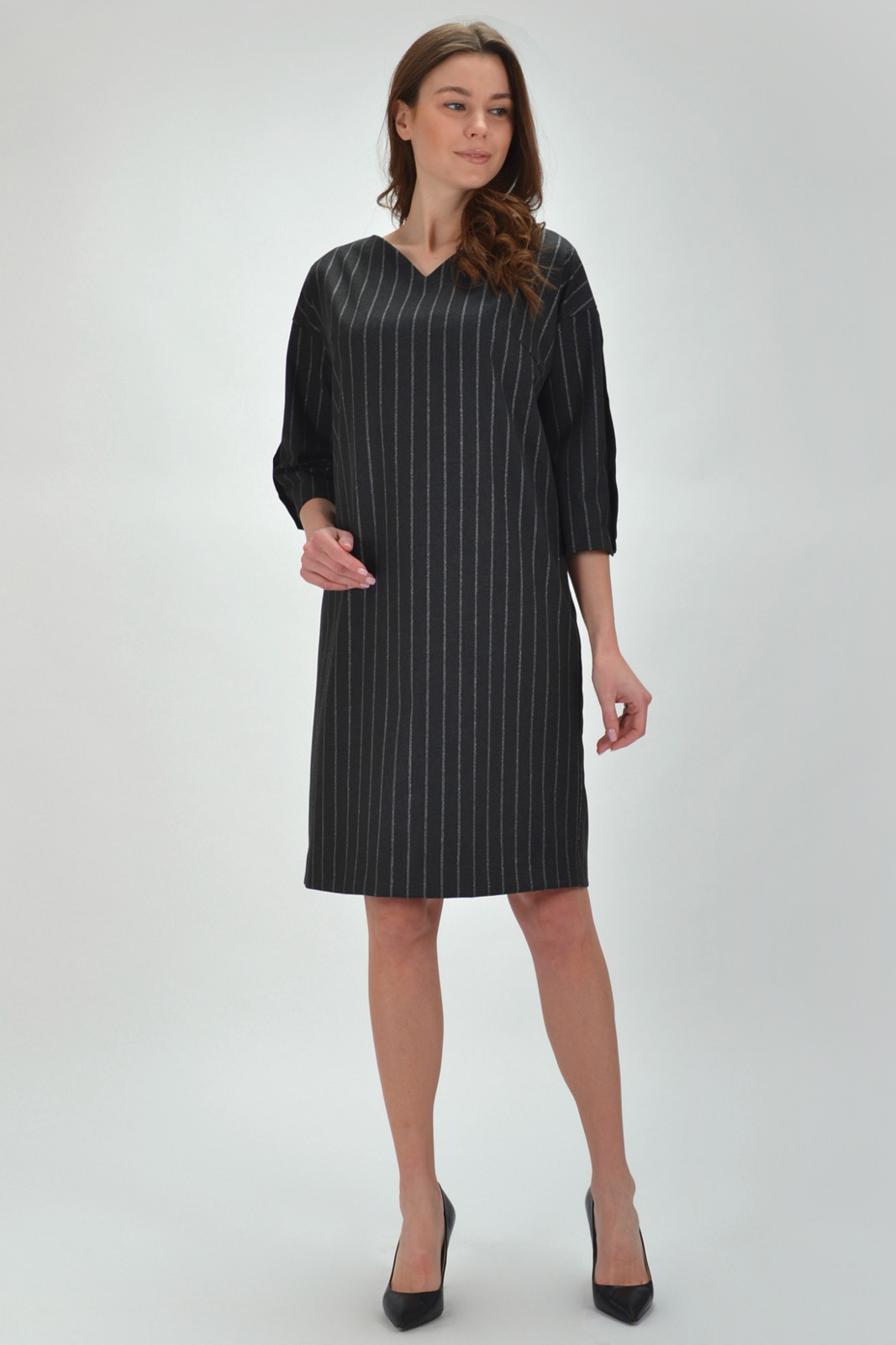 Платье прямого силуэта.По спинке застежка на пуговицы.Рукав 3/4 с декоративными пуговицами. Вырез горловины фигурный.В боковых швах карманы. Платье на подкладке.