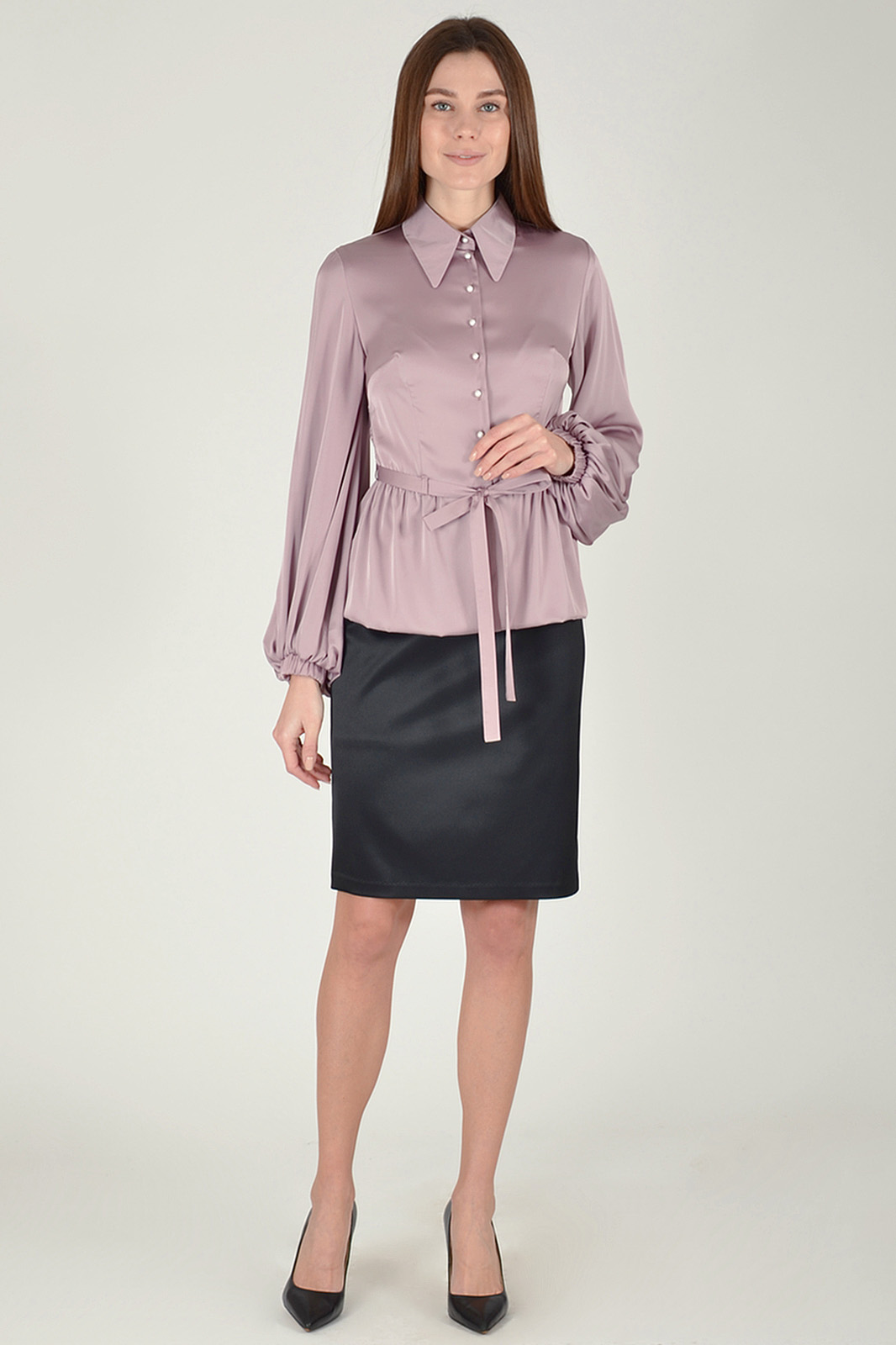Блузка приталенного силуэта отрезная по линии талии с баской. Рукав широкий на резинке. Воротник отложной.Изделие дополнено поясом.