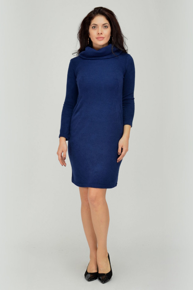 Платье женское из трикотажного полотна прямого силуэта. На полочке в рельефах карманы. Рукав длинный. Изделие без подкладки. Воротник "хомут".