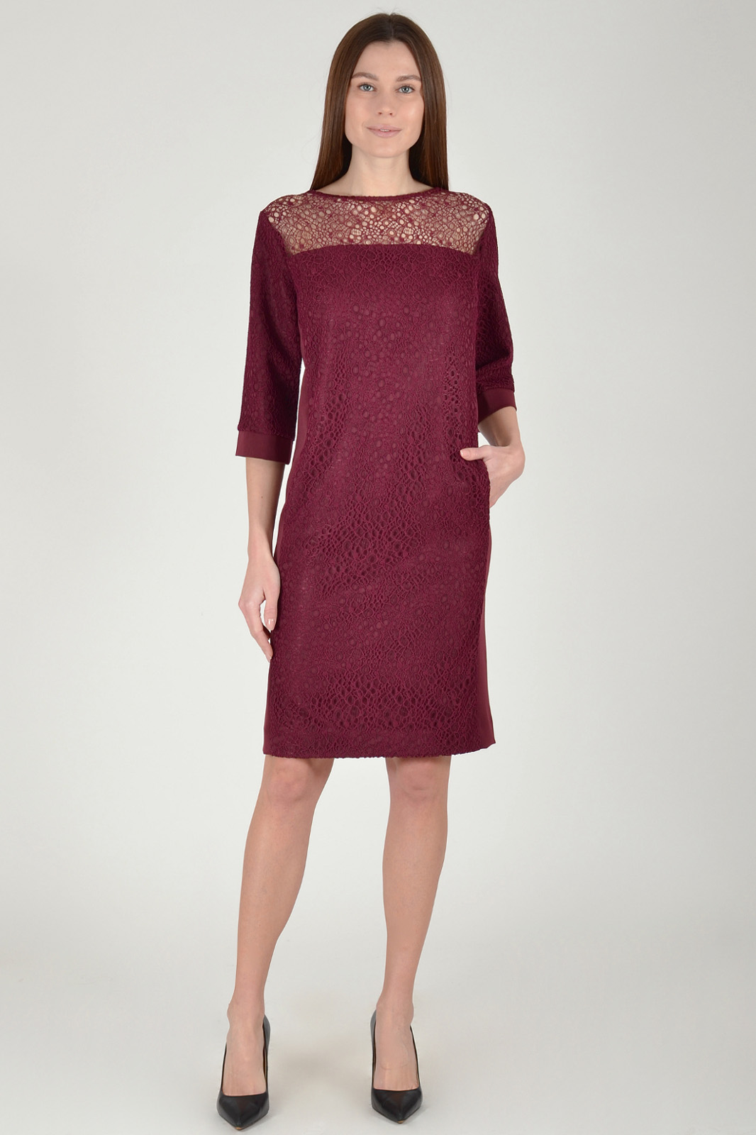 Платье прямого силуэта, рукав 3/4. По полочке,и рукавам наложено кружевное полотно.В рельефах карманы. Сзади шлица.