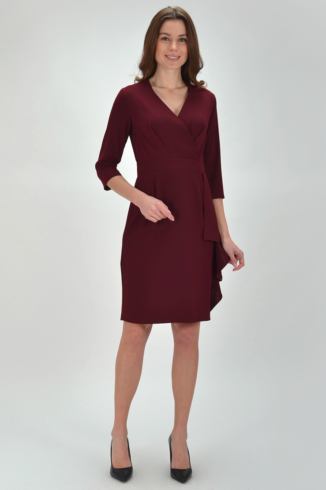 Платье отрезное по линии талии.Рукав 3/4.Втачной пояс.На груди "запах"со складками. Слева в боковом шве кокилье.