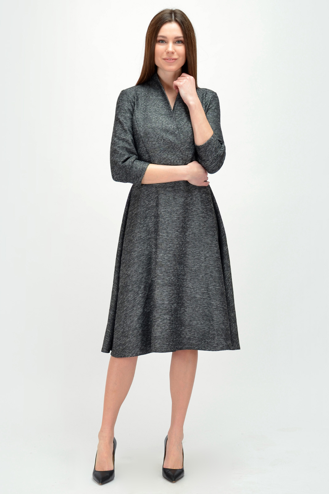 Платье отрезное по линии талии.Юбка расклешенная. Рукав 3/4 на манжете. Воротник-стойка цельнокроеный.Изделие дополнено поясом.