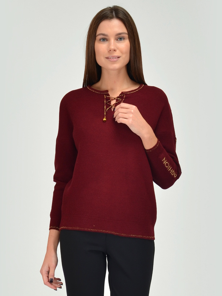 Джемпер женский из вязаного трикотажа прямого силуэта. Плечо спущенное. На рукаве декоративная надпись. Вырез горловины округлый. На полочке декоративный разрез со шнуровкой.