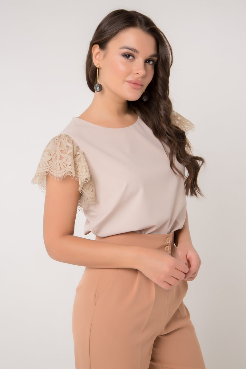Блузка из тонкой ткани прямого силуэта с рукавом-крылышко из кружева. Горловина округлая с застежкой-каплей по центру спинки. Длина по спинке 62 см.